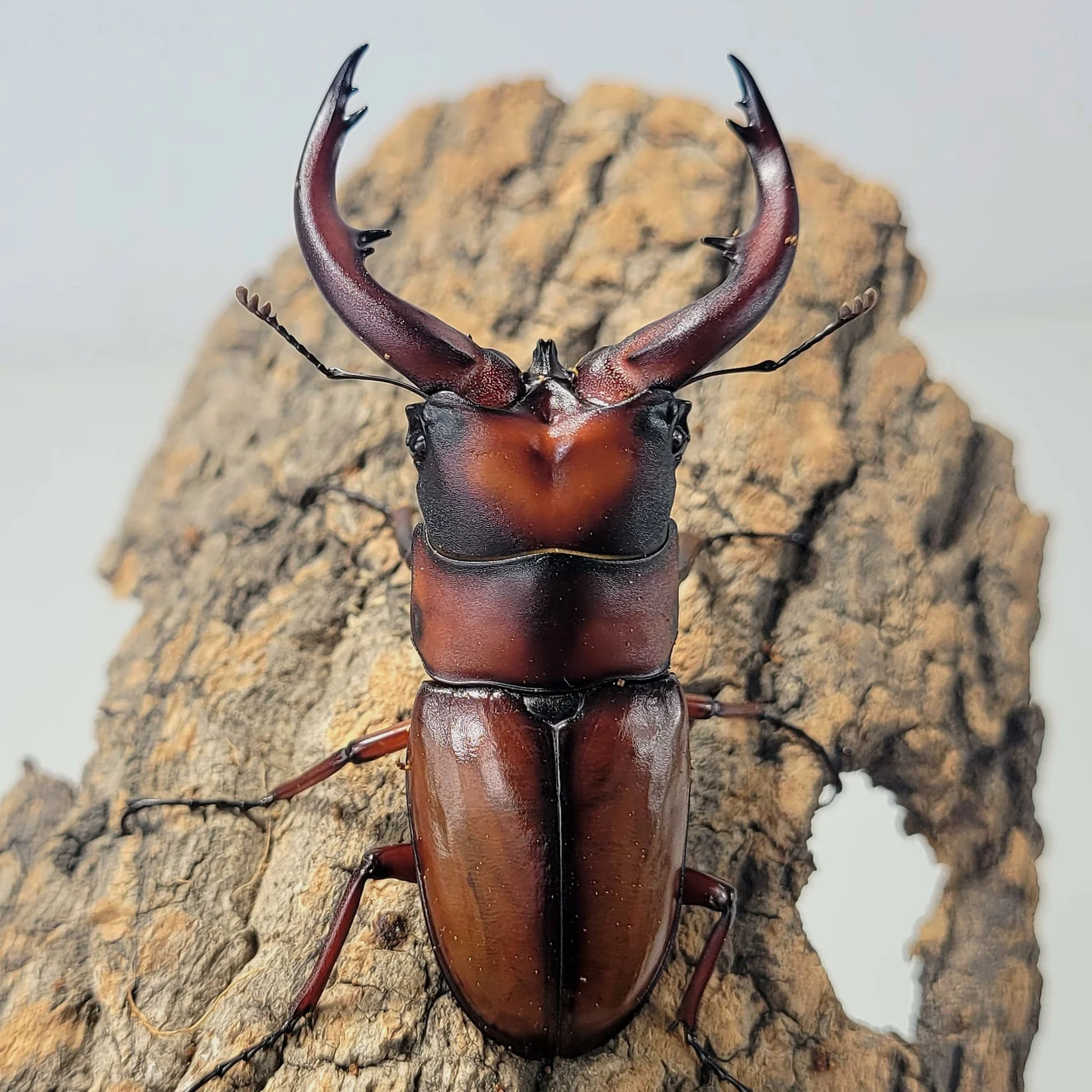 ノコギリクワガタらしい湾曲した力強い大顎を持ち、大型個体になると大歯型(内歯が発達した形)と中歯型・短歯型(小型個体に見られる)の顎の形状の違いも観察できます。体は全体的に毛が生えており、本土産ノコギリクワガタと比べてやや光沢が少ない印象です。離島固有種であるため自然採集には制限がある地域もあり、飼育個体(CB品・累代飼育品)での飼育・繁殖が一般的です。ブリードすると飼育下でも比較的容易に大型個体が作出でき、初心者でも70mm超えの個体を狙える点が人気の理由のひとつです。